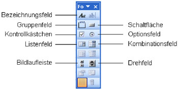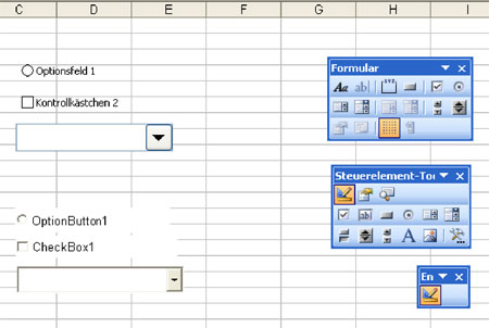 Um Tabellen mit Formularelementen zu gestalten, stellt Excel zwei äußerlich ähnliche Werkzeugsammlungen zur Verfügung, die sich in der Anwendung jedoch deutlich unterscheiden: die Symbolleisten "Formular" und "Steuerelement-Toolbox" (unter Ansicht / Symbolleiste).