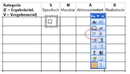 - Aktivieren Sie die Symbolleiste "Formular" unter Ansicht / Symbolleisten und zeichnen Sie ein Kontrollkästchen in das erste SMART-Feld. Klicken Sie dazu auf das entsprechende Werkzeug in der Symbolleiste und ziehen Sie dann mit gedrückter Maustaste ein Rechteck auf. Löschen Sie die Beschriftung "Kontrollkästchen 1" aus dem Element (Bild 4).