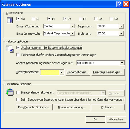 Hier können Sie im Bereich "Arbeitswoche" die Kontrollkästchen derjenigen Tage aktivieren, an denen Sie arbeiten sowie den Beginn und das Ende Ihres üblichen Arbeitstages festlegen. Die Einstellungen wirken sich sowohl auf die Farbbereiche in Ihrem Kalender aus (z.B. hellgelb bedeutet Arbeitszeit, dunkelgelb Freizeit) als auch auf die Besprechungsplanung, in der nur die angegebenen Tage und Zeiten als verfügbare Zeit markiert sind.