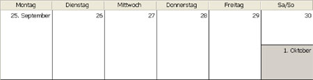 In der Monatsansicht werden Samstag und Sonntag standardmäßig in einer Spalte zusammengefasst (Bild 3). Falls dieser Platz zur Anzeige der Wochenendtermine nicht ausreicht, zeigt Outlook im Ausdruck der Monatsansicht lediglich den Hinweis "Weitere Elemente…", der jedoch keinen Rückschluss auf die Termine zulässt. Dieses Problem können Sie umgehen, wenn Sie jeden dieser Tage in einer eigenen Spalte anzeigen lassen.