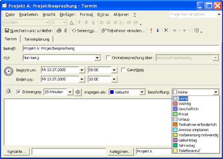 Erstellen Sie einen neuen Termin bzw. öffnen Sie einen bestehenden Termin und wählen Sie eine passende Farbe im Dropdown-Feld "Beschriftung" aus (Bild 1). Danach speichern und schließen Sie Ihren Termin über die gleichnamige Schaltfläche.