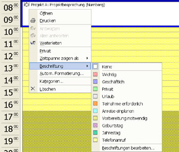 Öffnen Sie das Kontextmenü des betreffenden Termins, indem Sie mit der rechten Maustaste auf diesen Termin klicken. Sie können jetzt über den Menüpunkt "Beschriftung" eine passende Farbe auswählen (Bild 2).