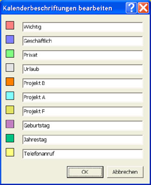 Um die Beschriftungen Ihren persönlichen Wünschen entsprechend zu definieren, klicken Sie auf einen Termin und wählen Sie im Kontextmenü den Eintrag "Beschriftungenbearbeiten". Alternativ gelangen Sie über den Menüpunkt Bearbeiten / Beschriftung / Beschriftungen bearbeiten zu dem entsprechenden Fenster (Bild 3). Hier können Sie jeder Farbe eine neue Beschriftung zuweisen. Klicken Sie auf die Schaltfläche OK, um die Eingaben zu übernehmen.