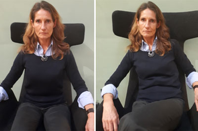 Bild 2: Links Körperhaltung nach kK:, rechts eine ungünstige Sitzposition und Mimik: Der Oberkörper ist gebeugt und sinkt nach hinten ab; dazu passt der zur Seite gezogene Mundwinkel (mimische Emotion der Verachtung).