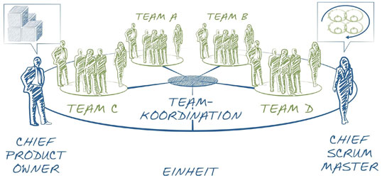 Ein wichtiges Element von Scrum ist die Gewaltenteilung. Statt eines Projektleiters definiert Scrum drei sorgfältig ausbalancierte Rollen. So ist der Product Owner für ein erfolgreiches Produkt, das Entwicklungsteam für funktionierende Produktinkremente und der Scrum Master für wirksames Arbeiten verantwortlich. Der Vorteil der Gewaltenteilung: Durch die Balance kommt es zu austarierten Entscheidungen, die dem Unternehmen als Ganzes wirtschaftlich besser nutzen. Bei "Scaled Agile" setzen Unternehmen deshalb die Gewaltenteilung auch auf einer höheren Ebene fort, z.B. der Abteilungsebene. Statt eines Abteilungsleiters oder Programm-Managers gibt es einen Chief Product Owner und einen Chief Scrum Master - und natürlich die Teams.