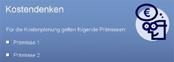 - Geben Sie Anregungen zum Thema "Kostendenken". Formulieren Sie Prämissen für die Kostenplanung (Bild 1), leiten Sie daraus Prioritäten für das Budget ab und stellen Sie Parallelen zu ähnlichen Projekten her. Damit zeigen Sie, dass Sie die Zahlen nicht einfach so hinnehmen, sondern sie analysieren. Das schafft Vertrauen beim Publikum. Bringen Sie alternative oder provokative Gedanken, um die Zuschauer für die Daten zu sensibilisieren, die Sie anschließend vorlegen werden.