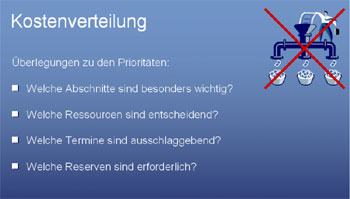 - Thematisieren Sie die Kostenverteilung. Erklären Sie, dass es in dem Projekt unterschiedlich wichtige Abschnitte, Ressourcen, Termine usw. gibt, die auch finanziell differenziert betrachtet werden müssen. Machen Sie deutlich, wo Prioritäten liegen und wo besondere Aufwendungen nötig sind.