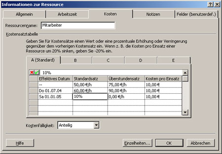 Für den Fall, dass Sie eine Ressource für verschiedene Tätigkeiten (für die jeweils unterschiedliche Kostensätze gelten) einsetzen wollen, bietet Ihnen Microsoft Project die Möglichkeit, fünf verschiedene Kostensätze pro Ressource anzugeben. Für jeden Kostansatz sind bis zu 25 zeitliche Änderungen möglich. Die Werte dort können entweder als absolute Werte (z.B. "60,00 €") oder in Prozent gegenüber der vorherigen Phase (z.B. "10%") eingegeben werden (Bild 1). Microsoft Project rechnet Prozentwerte nach der Eingabe selbstständig in absolute Werte um. Zum entsprechenden Dialogfeld gelangen Sie entweder über den Menüpunkt Projekt / Informationen zur Ressource oder in der Ansicht Ressource: Tabelle durch Doppelklick auf eine Ressourcenzeile.
