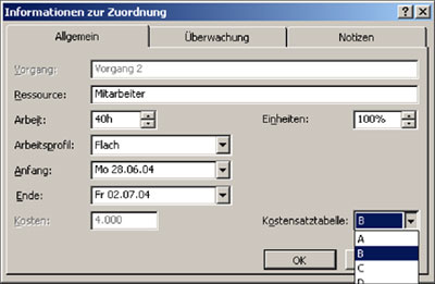 Mit einem Doppelklick auf eine Zuordnungszeile öffnen Sie immer den Dialog "Information zur Zuordnung" und nicht die Dialoge "Informationen zur Ressource" oder "Informationen zum Vorgang", obwohl Sie auf einen Vorgangsname bzw. Ressourcennamen geklickt haben. Wie in Bild 2 können Sie an dieser Stelle, die nicht einfach zu finden ist, die gewünschte Kostensatztabelle für die gewählte Zuordnung einstellen.
