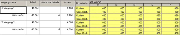 - Welche Kostensatztabelle als Standard verwendet wird, lässt sich nicht einstellen. Bei Zuordnungen setzt das Programm immer die Werte der Tabelle A ein. Zwar lässt sich in Ressourcentabellen die Spalte "Kostensatztabelle" einblenden, jedoch zeigt sie in Ressourcenzeilen keinen Inhalt und ist dort auch nicht editierbar.