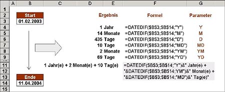 Bild 1: Die Funktion DATEDIF berechnet die Jahre, Monate und Tage zwischen zwei Terminen.