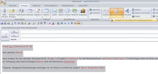 Der Projektleiter schickt dem Projekt-Auftraggeber einmal wöchentlich den aktuellen Statusbericht per Mail. Neben den individuellen Informationen, enthält der Text gewisse Standardformulierungen, die sich in jeder Mail wiederholen. Aus diesem Grund legen Sie in Outlook einen Schnellbaustein mit der Bezeichnung "Projektstatus" an. Dieser Baustein enthält beispielsweise folgenden Text: