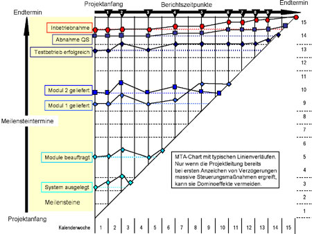 Unverzichtbar wird der Überblick über die wesentlichen Stationen eines Projekts, sobald mehrere Organisationseinheiten (Abteilungen, Unternehmen) ihre Planung aufeinander abstimmen müssen. Werden in der Planungsphase zentrale Meilensteine vereinbart und in der Durchführungsphase mittels MTA überwacht, erhält das Management die nötige Übersicht über Termine und Ergebnisse. Die Kostenkontrolle muss parallel dazu erfolgen, ist aber nicht Gegenstand dieses Beitrags.