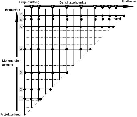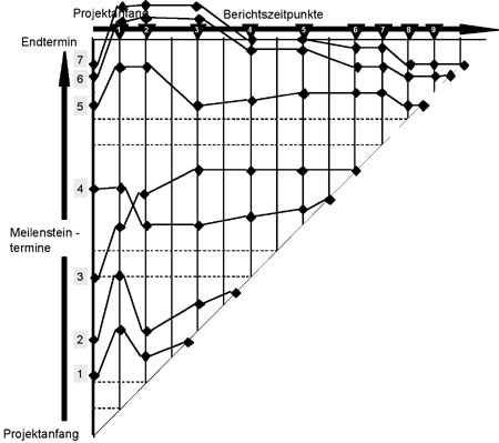 - Die Dreiecksform des Charts ergibt sich daraus, dass unerledigte Meilensteine immer erst nach dem jeweiligen Berichtszeitpunkt liegen können. Erledigte Meilensteine werden in dieser Darstellung genau auf der Diagonalen platziert: Soll- und Ist-Zeit stimmen überein.