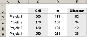 In Projekten ist es üblich, die tatsächlichen Kosten in periodischen Abständen zu kontrollieren und mit den geplanten Kosten zu vergleichen. Im folgenden Beispiel sollen für vier Projekte jeweils die Plankosten mit den tatsächlichen Kosten verglichen werden.
