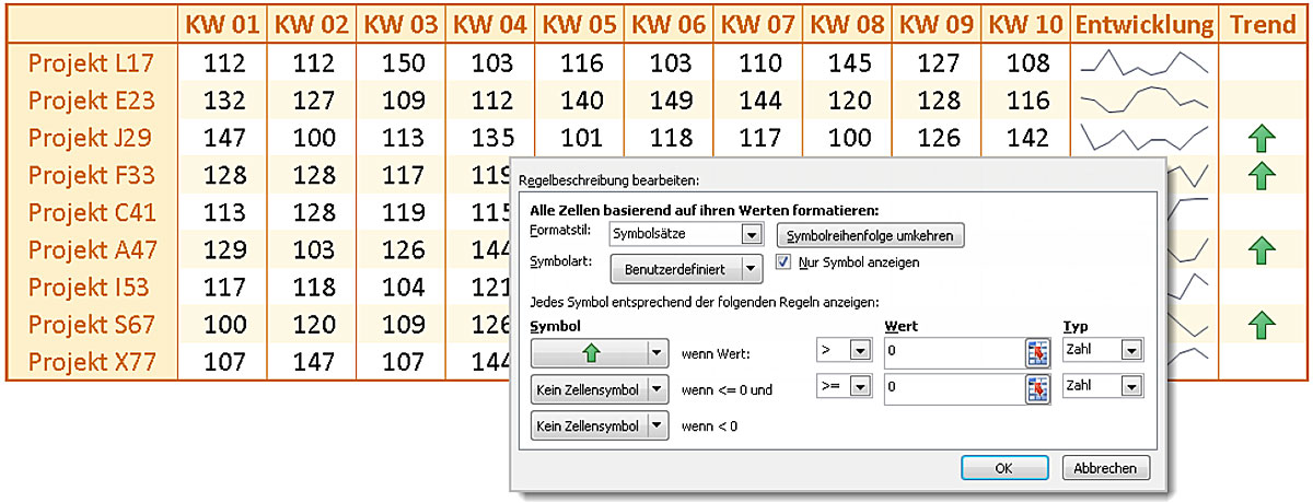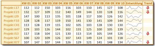 Egal, ob Sie eingesetzte Arbeitskräfte, angefallene Projektstunden oder ‑kosten überwachen möchten – um auf einen Blick zu erkennen, wie sich der Status seit dem vorangegangenen Kontrollintervall verändert hat, sind Trendpfeile eine gute Lösung. Sie ersparen Ihnen das zeitraubende Studium der Einzeldaten. Bild 1 stellt eine mögliche Variante dar, bei der in der Spalte "Trend" automatisch rote Abwärtspfeile erscheinen, wenn der aktuelle Wert niedriger ist, als der der Vorwoche. Das Zahlenmaterial ist in dem Fall bewusst neutral gehalten, denn die vorgestellte Lösung lässt sich vielfältig verwenden. Anwender von Excel 2010 können sich überdies dank der neuen Funktion "Sparklines" die Entwicklung der Daten in einer Zeile oder einer Spalte kompakt mit einem Minidiagramm anzeigen lassen. Die Sparklines erzeugen Linien- oder Säulendiagramme in einer Zelle und ermöglichen so einen schnellen Vergleich der Entwicklung zwischen den Daten mehrerer Zeilen (Bild 1, Spalte "Entwicklung").