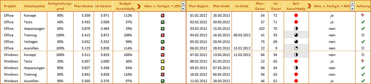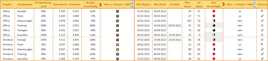 Bild 2: Mit Ampeln die Kosten überwachen, mit Harvey Balls die verstrichene Projektzeit anzeigen, mit roten Fähnchen Warnsignale setzen und über die Drehfelder in den Spaltenüberschriften die Grenzwerte für die Kosten- und Terminüberwachung komfortabel ändern.