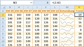 Bild 3: In Spalte N die Differenz zwischen dem aktuellen Wert und dem der vorangegangenen Kalenderwoche berechnen.