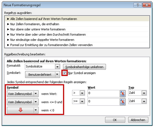 Bild 4: Damit Excel 2010 nur rote Pfeile für einen Abwärtstrend anzeigt, lassen sich die grünen und gelben abwählen.