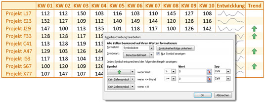 Sparklines gibt es in Excel 2007 noch nicht, Trendpfeile sind dagegen sowohl in Excel 2007 wie auch in 2010 verfügbar. Im vorliegenden Beispiel sollen sie erscheinen, wenn die Differenz zwischen dem aktuellen Wert und dem der Vorwoche kleiner als 0 ist. Die Differenz berechnen Sie dazu in einer eigenen Spalte. Hier die Schritte im Detail: