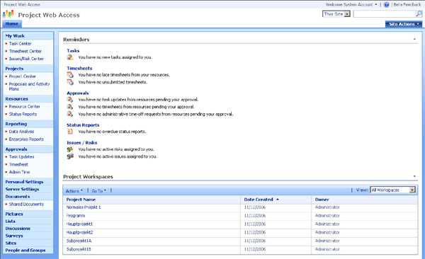 Der Termin für die Verfügbarkeit von Microsoft Office Project 2007 rückt immer näher. Die finale Version soll im Dezember 2006 für Partner und Großkunden zum Download bereit stehen, im Januar 2007 soll sie dann für jedermann erhältlich sein. Die Neuerungen in Microsoft Office Project Professional 2007 wurden bereits in Ausgabe 9/2006 vorgestellt. Die Software lag zum Zeitpunkt der Veröffentlichung in einer Beta-Version vor (Version Beta 1), die allerdings schon einen annähernd finalen Zustand hatte. Für den Server traf das damals allerdings noch nicht zu. Die derzeit aktuelle Version Beta 2 TR (Technical Refresh) soll dem Endprodukt jedoch von den Funktionen her gleich sein, so dass wir den Server in diesem Beitrag ausführlich unter die Lupe nehmen können.