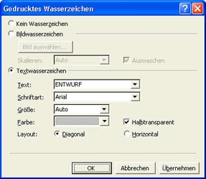Um ein Wasserzeichen zu entfernen rufen Sie den Dialog erneut auf und wählen Sie die Option "Kein Wasserzeichen".
