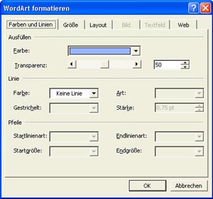 - Wählen Sie im Register "Farben und Linien" die Farbe aus und stellen Sie die Transparenz auf ungefähr 50% ein (Wasserzeicheneffekt).