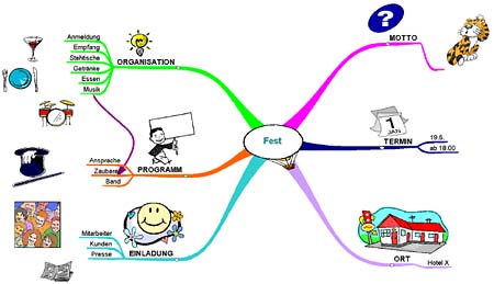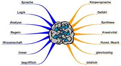 Wenn Sie jetzt auch die Fähigkeiten der rechten Gehirnhälfte ins Spiel bringen, kommt es zu einem Synergie-Effekt. Die Mind Map einer Mitschrift geht von einem Zentralthema aus und lässt sich organisch erweitern. Farben, Bilder und Symbole stellen vielfältige Verbindungen und Assoziationen zu bereits vorhandenem Wissen her.