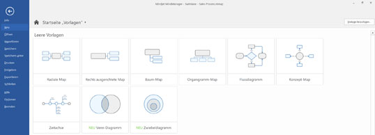 Bild 1: Neben verschiedenen Mindmaps bietet MindManager unter anderem Vorlagen für Flussdiagramme, Concept Maps und Zeitachsen an. Außerdem können Anwender eigene Vorlagen, etwa für SWOT-Analysen erstellen.