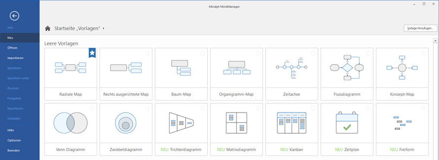 Bild 1: Neben verschiedenen Mindmaps bietet MindManager auch Vorlagen für Flussdiagramme, Kanban-Boards und Zeitachsen an. Außerdem können Anwender eigene Vorlagen, etwa für SWOT-Analysen, erstellen.
