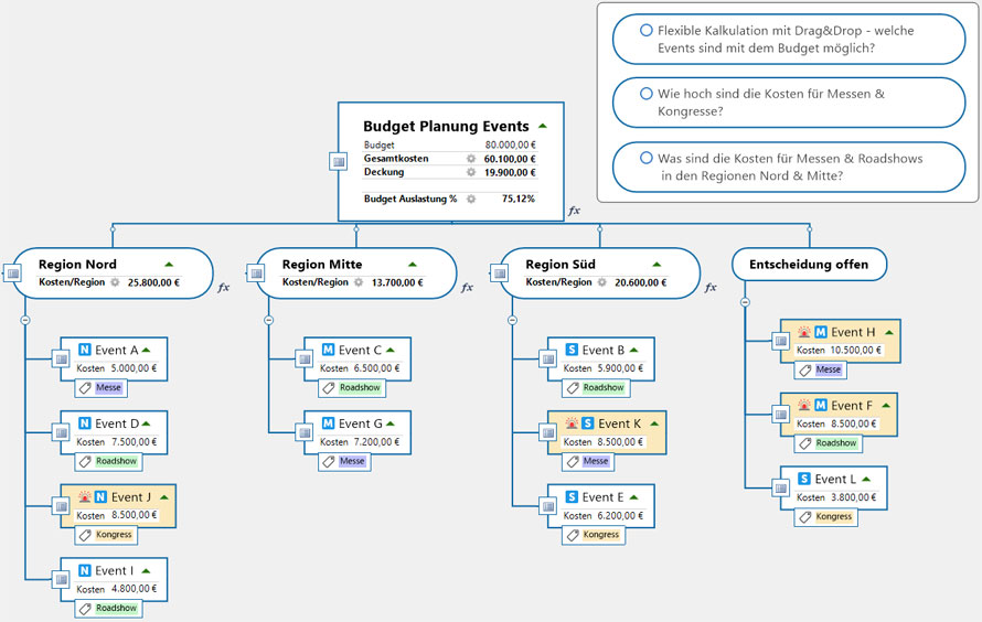 Bereits durch die Gliederung der Mapinhalte entsteht Übersicht. Darüber hinaus helfen Volltextsuche und Filterfunktionen dabei, den Überblick zu behalten. Zweige, auf welche die Filterkriterien zutreffen, können eingeblendet, abgeblendet (d.h. verblasst angezeigt) oder ganz ausgeblendet werden, um die Konzentration auf die gewünschten Zweige zu lenken.
