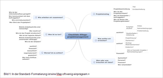 Trotzdem verzichten viele Anwender auf eine individuelle Formatierung ihrer Maps, weil sie den Zeitaufwand scheuen. Aufwändig ist diese Arbeit jedoch nur, wenn Sie Schrift, Farbe, Formen und Anordnung der Zweige einzeln formatieren und diese Formatierung für jeden neuen Ast manuell ergänzen müssen. Mit einer Mapvorlage gelingt dies dagegen mit nur wenigen Mausklicks, so dass Sie schnell leicht erfassbare und einheitliche Ergebnisse erhalten (Bild 2).