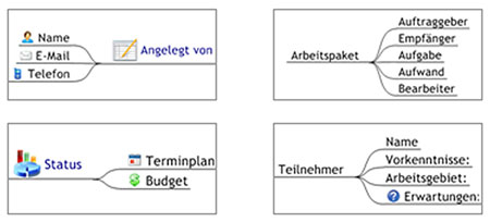 Am besten legen Sie für Ihre Projekte bereits im Vorfeld fest, wie die Maps z.B. für Projektaufträge, Projektpläne, Projektsteuerung oder für Projektbesprechungen aussehen und welche Zweige darin enthalten sein sollen. Um Klarheit und Übersicht in Ihren Maps zu erhalten, definieren Sie darüber hinaus die Stilelemente, die generell für alle Maps gelten sollen, wie z.B. Farben, Formen und Icons. MindManager stellt dazu verschiedene Vorlagentypen bereit.
