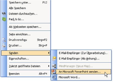 Wollen Sie in Version X5 des MindManager selektiv nur ausgewählte Zweige exportieren, dann verwenden Sie die Befehlsfolge Datei / Senden an / PowerPoint.