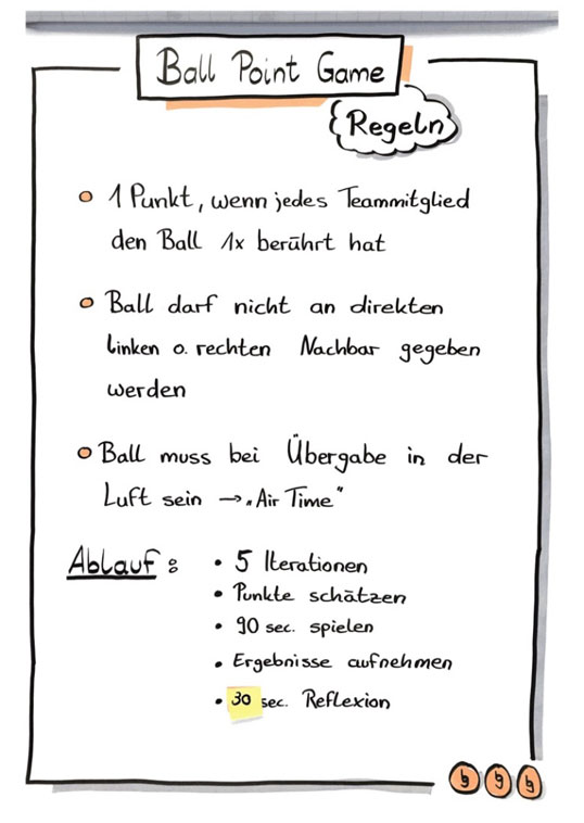 Beim Ball-Point-Game soll das Team eine "menschliche Ballmaschine" bauen. In mehreren Zyklen wird simuliert, wie ein agiler Prozess aussieht und – noch wichtiger – wie sich die Zusammenarbeit in einem echten Team anfühlt. Die Teilnehmer erleben unterschiedliche agile Elemente sowie Meetings und können Erfahrungen in einem selbstorganisierten Team sammeln.
