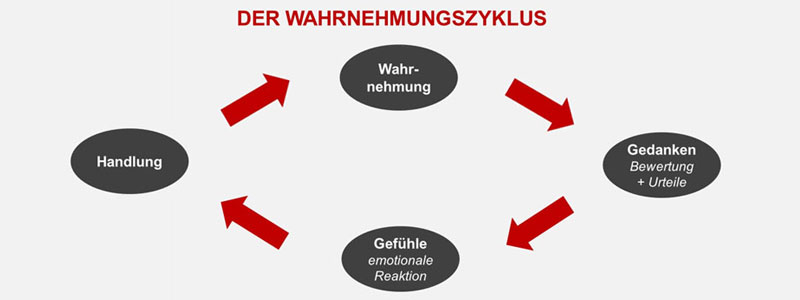Bild 1: Jede Aktivität entspringt unseren Gedanken und unserer emotionalen Reaktion darauf. Um die Wirkung zu ändern, müssen wir uns unsere Gedanken und Gefühle bewusst machen.