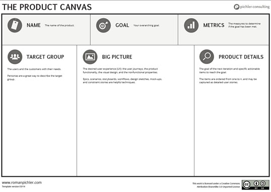 Keine Angaben liefert das Business Model Canvas dazu, welche Eigenschaften das Produkt im Einzelnen besitzen muss, damit es den angestrebten Nutzen erzielen kann. Um diese Einzelheiten zu klären, eignet sich das Product Canvas nach Roman Pichler. Dieser wollte damit ein Hilfsmittel für Unternehmen schaffen, um Produkte mit tollem Nutzererlebnis und den richtigen Funktionalitäten zu entwickeln.