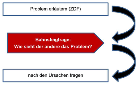 Allzu oft gehen wir bei einem Problem in naiver Weise davon aus, der andere würde die eigene Sichtweise teilen. Dieser Denkfehler lässt sich durch die Bahnsteigfrage leicht vermeiden. In unserem Beispiel sollte der Projektleiter, statt direkt über die Ursachen für die Verzögerung zu sprechen, zunächst fragen, ob die Problembeschreibung für Robert nachvollziehbar ist und wie er das Problem bewertet (Bild 2).
