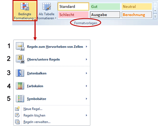 Der Befehl Bedingte Formatierung befindet sich in der Gruppe Formatvorlagen auf der Registerkarte Start (siehe Bild 2). Der Klick auf das Symbol öffnet eine Auswahl, die im oberen Teil fünf verschiedene Kategorien für vorgefertigte Formatierungsregeln enthält. Mit diesen vordefinierten Regeln kennzeichnen Sie automatisch Daten, die bestimmte Kriterien erfüllen, und zwar ohne umständliche Formeln. Auch wenig geübte Anwender finden sich hier schnell zurecht.