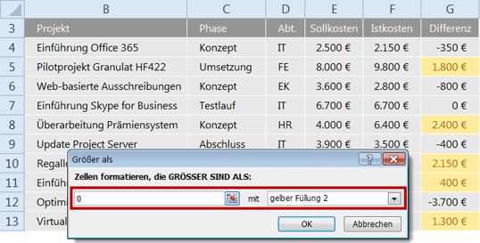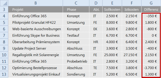 Die Übersicht in Bild 4 listet Plan- und Istkosten für laufende Projekte auf. Spalte G enthält die Differenz von Ist- und Sollkosten. Bei allen Werten, bei denen die Differenz größer als 0 ist, wurden die Kostenvorgaben überschritten. Diese Fälle sollen ohne langes Studium der Zahlen auf einen Blick erkennbar sein. Heben Sie diese mit der Regel Größer als hervor.