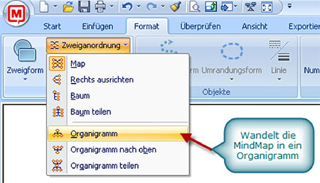 Um die MindMap strukturierter darzustellen, verändern Sie den Zweiglinienstil von "Bogen" auf "Winkelform" bzw. "Abgerundete Winkelform" (wie z.B. in Bild 2). Diese Einstellung finden Sie unter Format / Zweige / Zweiglinienstil (Bild 3; ab MindManager 9: Start / Format / Zweiglinien).