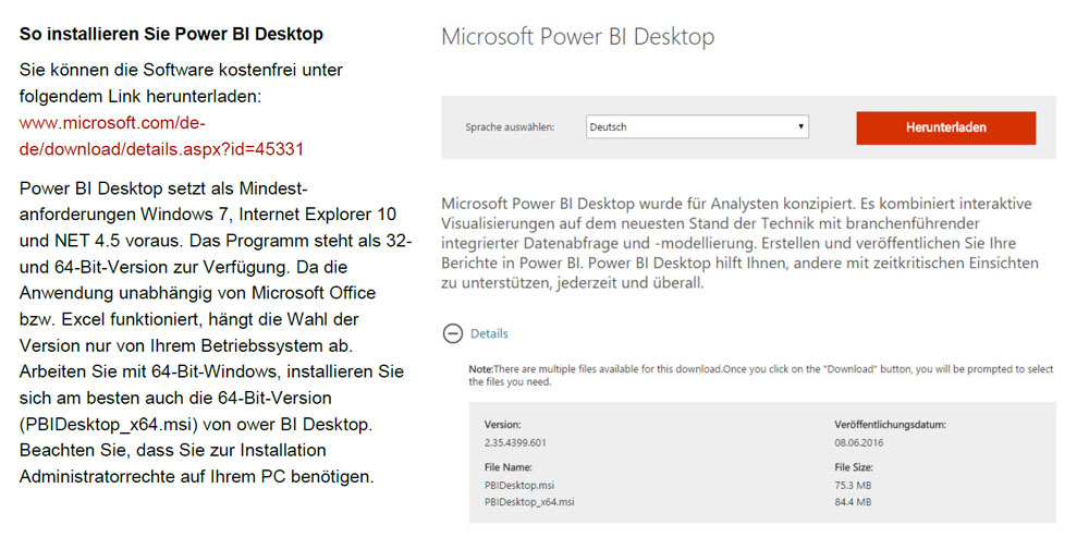 Bild 2: So installieren Sie Power BI Desktop (herunterladbar unter: www.microsoft.com/de-de/download/details.aspx?id=45331