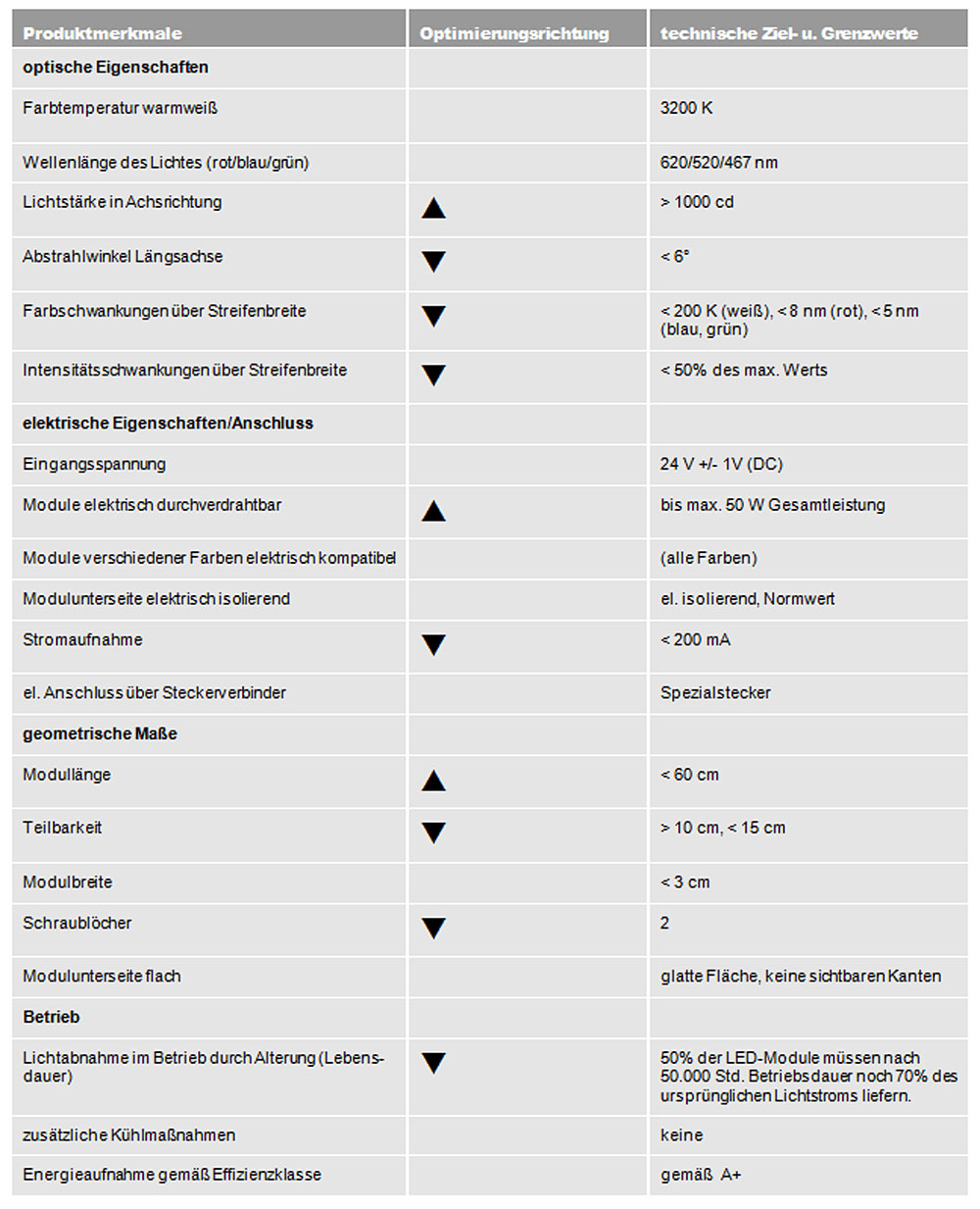 Die Kundenanforderung "Lichtstreifen gut sichtbar über Raumhöhe" kann z.B. durch die Spezifikation "10 helle LED des Typs X vom Hersteller Y" gut erfüllt werden. Dies stellt allerdings bereits eine mögliche Lösung dar und schränkt die Anzahl der Lösungsmöglichkeiten an dieser Stelle unnötig ein. Vielleicht findet sich ja ein anderer Hersteller, bei dem bereits 8 LEDs genügen. Ein besseres Qualitätsmerkmal ist "Lichtstärke in Achsrichtung", das im weiteren Schritt durch die Optimierungsrichtung ("höhere Lichtstärke") und einen messbaren Ziel- oder Grenzwert (z.B. ">1000 cd") beschrieben wird.
