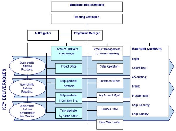 Projekte bei O2 werden in einer Matrix-Organisation abgewickelt. Der Mitarbeiter ist im Rahmen seiner Projektaufgabe fachlich dem Projektmanager unterstellt, disziplinarisch bleibt er der jeweiligen Linie zugeordnet. Der Mitarbeiter ist gegenüber dem Projektmanager dafür verantwortlich, sein Arbeitspaket inhaltlich richtig, vollständig und rechtzeitig abzuliefern. Dieses Rollenverständnis ist im Projektmanagement-Handbuch hinterlegt und wird in einer so genannten Project Requirements Definition (PRD) festgehalten. Die PRD ist somit das auf das jeweilige Projekt zugeschnittene Abwicklungshandbuch.