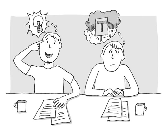 Bild 1: Der Teamleiter (rechts) ist überzeugt davon, dass der Projektleiter sich vom Kunden auf der Nase rumtanzen lässt und das Projekt in einer Sackgasse steckt. Der Teilprojektleiter (links) ist aufgeschlossen gegenüber den Ausführungen des Projektleiters und erhält so neue Erkenntnisse über den Kunden. (Illustration aus: Trölenberg, Helga; Drathen, Heiner: Crashkurs IT-Projektleitung, Soft Skills, Kommunikation und Führung in IT-Projekten, Haufe 2016).