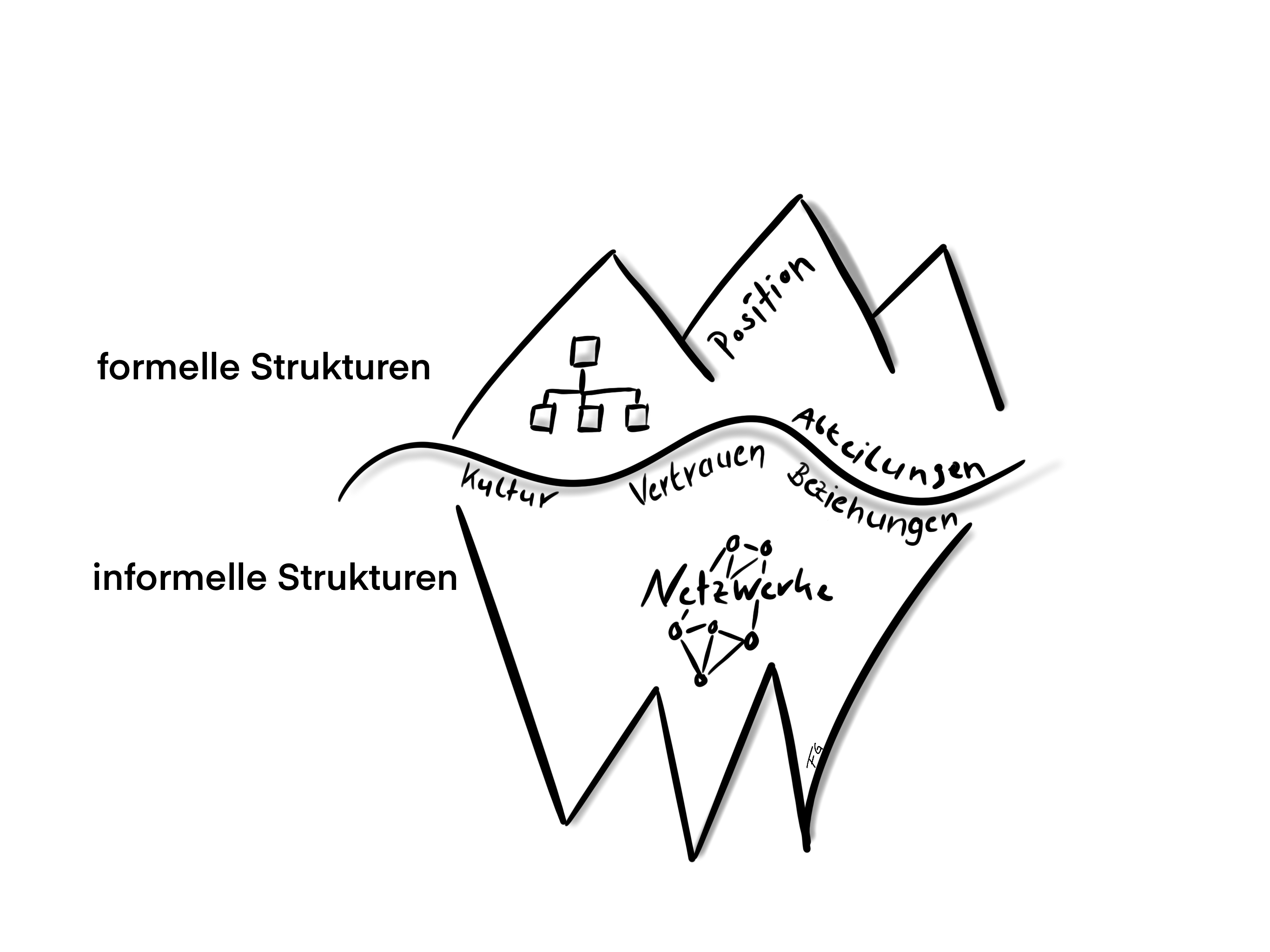 In jeder Organisation finden sich formelle und informelle Strukturen. Visualisiert man diese mithilfe des Eisbergmodells, finden Sie über der Wasseroberfläche die formellen Strukturen, die sich in Positionen, Abteilungen und dem Organigramm ausdrücken. Unter der Wasseroberfläche befinden sich die informellen Strukturen. Das sind die Netzwerke zwischen den Menschen, besondere Werte oder Ausprägungen der Unternehmenskultur – also all das, was Sie nicht sehen, jedoch tagtäglich spüren.