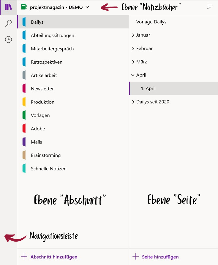 Bild 2: Drei Ebenen sind für ein strukturiertes Notizbuch relevant: die Ebenen "Notizbücher", "Abschnitt" und "Seite".