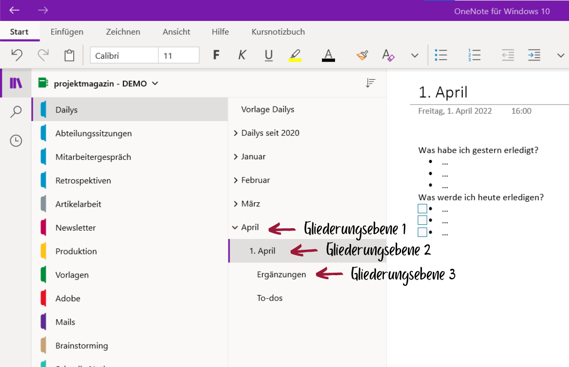 Das A und O für eine effiziente Arbeitsorganisation mit OneNote ist eine aufgeräumte Ordnerstruktur. Bevor Sie blindlings Abschnitte und Seiten hinzufügen, überlegen Sie, welche Kriterien für Sie wichtig sind. Nur so können Sie für eine gute Arbeitsgrundlage sorgen. Kriterien für das Meetingformat "Daily" könnten z.B. sein: