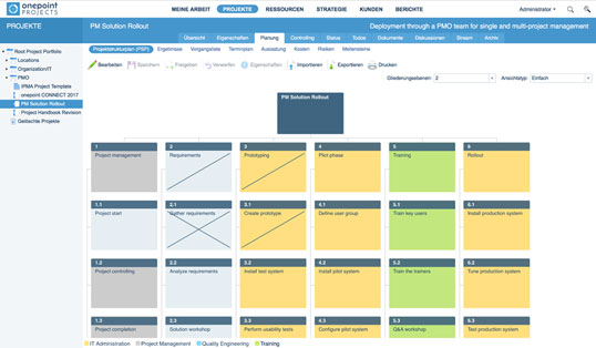 Um die Strategie – und damit die geplanten Projekte – mit onepoint PROJECTS umzusetzen, stellt die Software eine einfach zu bedienende Projektplanungs-Funktion zur Verfügung. Diese deckt die wichtigsten Aspekte der gängigen Projektmanagement-Methoden ab. Aus einer Liste am oberen Fensterrand wählt der Anwender mit einem Klick den Arbeitsbereich "Projekte" für die Projektplanung aus. Die Software zeigt dann am linken Fensterrand alle Projekte an, auf die der Anwender zugreifen darf. Lange Projektlisten strukturiert man, indem man die Projekte einem oder mehreren Portfolios zuweist.