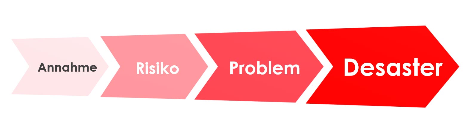 Verlässt man die erste Etappe des Pfads des Projekt-Desasters nicht rechtzeitig, gelangt man automatisch auf die nächste Etappe "Risiko". Mit anderen Worten: Es entsteht ein Risiko bei dem Thema, zu welchem man eine Annahme getroffen hatte.